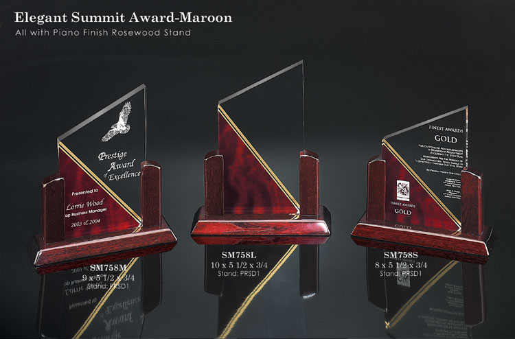 We can produce acrylics in custom shapes and sizes, reproduce logo shapes and find reflective colors such as gold, purple, blue, red or green to accent your acrylic awards. If you have an idea for a unique award, contact us and let us help you make it a reality. As always, if you have any questions about whether a particular shape or product is available, just contact us and we'll be glad to answer your questions. Some of the designs below are available in clear, glacier blue or jade green acrylic, as well as blue marble or rosewood. By clicking on the links below you will be able to view a large variety of acrylic designs, acrylic gifts, acrylic plaques and acrylic clocks.
