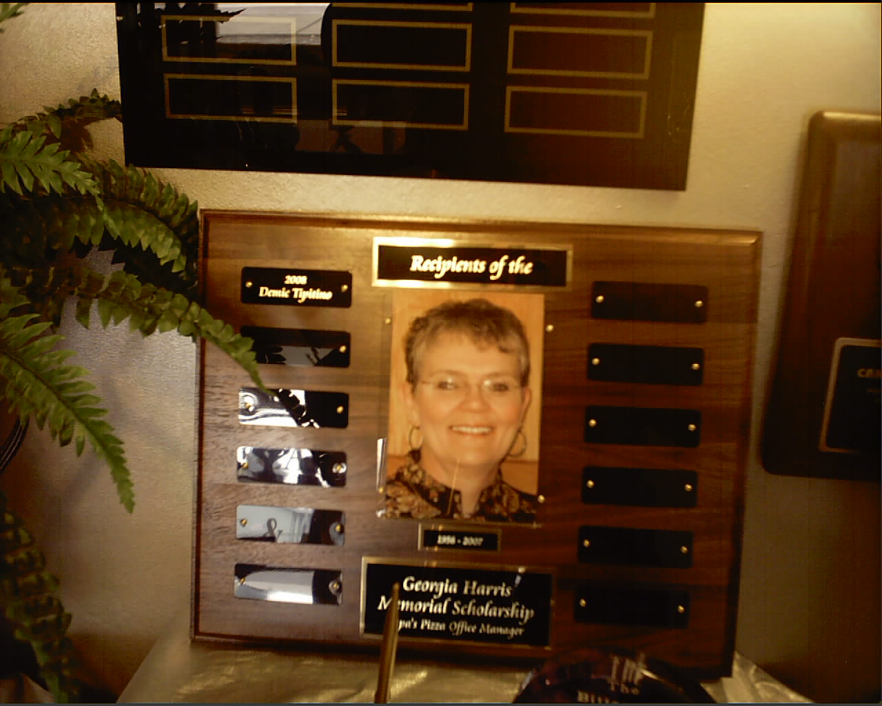 The plaque shown in the center is a custom layout, including a 4" x 6" photo and a custom engraved plate layout, along with 12 perpetual plates on a 12" x 15" solid walnut plaque.