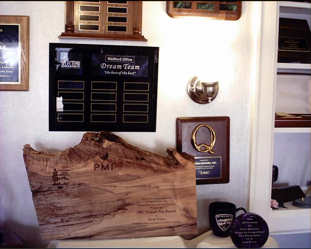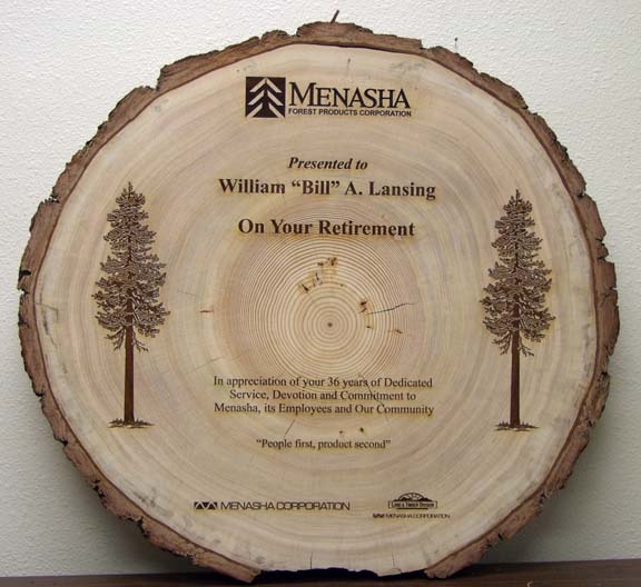 Often we will get a request from a client to create a plaque that is truly unique. That is the case for the plaques shown above. The wood slab of Douglas Fir shown on the upper left represented a material the company is famous for, and was approximately 2 feet round. The copy was lasered directly in to the wood, creating a memorable and stunning finished product that was an honor to give & receive. The other plaques shown were particularly chosen in shape and grain to match the purpose of the presentation and each individual recipient.