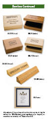 Shown above are a sampling of our walnut, oak and furniture quality cherrywood plaques. We also provide custom plaques made of alder, maple, pine, bamboo, mahogany and exotic woods. Plaques can be rectangular as shown above, or custom shaped. We also have plaques (see bottom of this page for more ideas) made of glass, acrylic and other materials. Price for all plaques depends on what final choices are made in the material, engraving plate material, attachments etc.