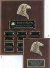 Shown below is just an example of the styles of perpetual plaques available. The example on the left is shown using mahogany finished, American walnut plaques and antique bronze eagle attachments. We recommend ordering a smaller plaque in a similar style to the perpetual plaque to give to the recipient. They really appreciate it! We've had clients who have come back to us to reorder another perpetual because the recipient would not give back the larger award plaque!